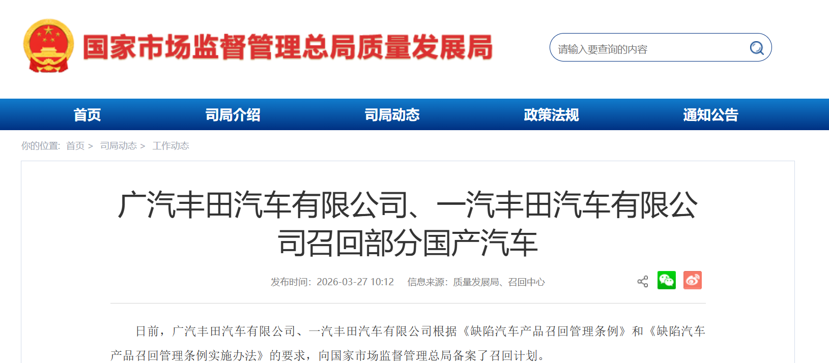 日前,广汽丰田汽车有限公司与一汽丰田汽车有限公司依据《缺陷汽车产品召回管理条例》及其实施办法的相关规定,联合向国家市场监督管理总局备案了召回计划,宣布自2026年4月1日起,对旗下部分存在安全隐患的车型实施召回。